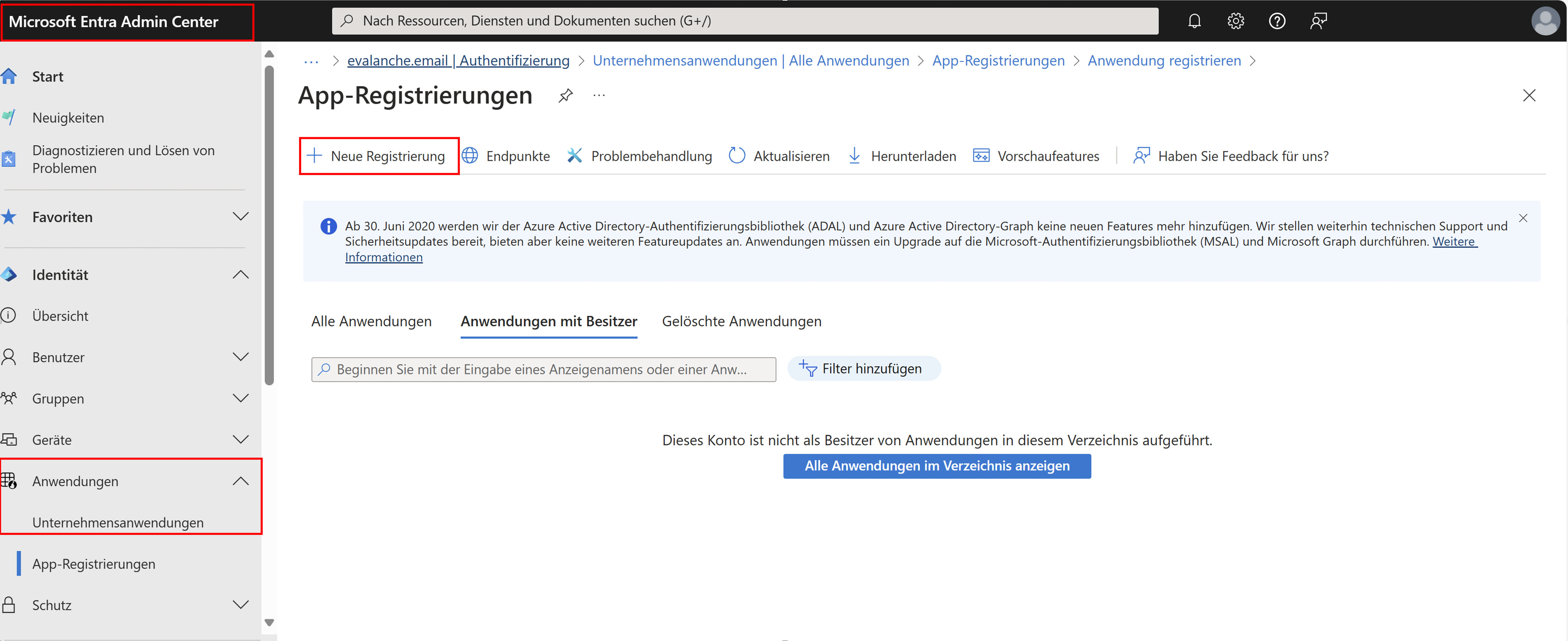 - Klicken Sie in der linken Leiste auf App-Registrierungen und klicken Sie anschließend auf Neue Registrierung