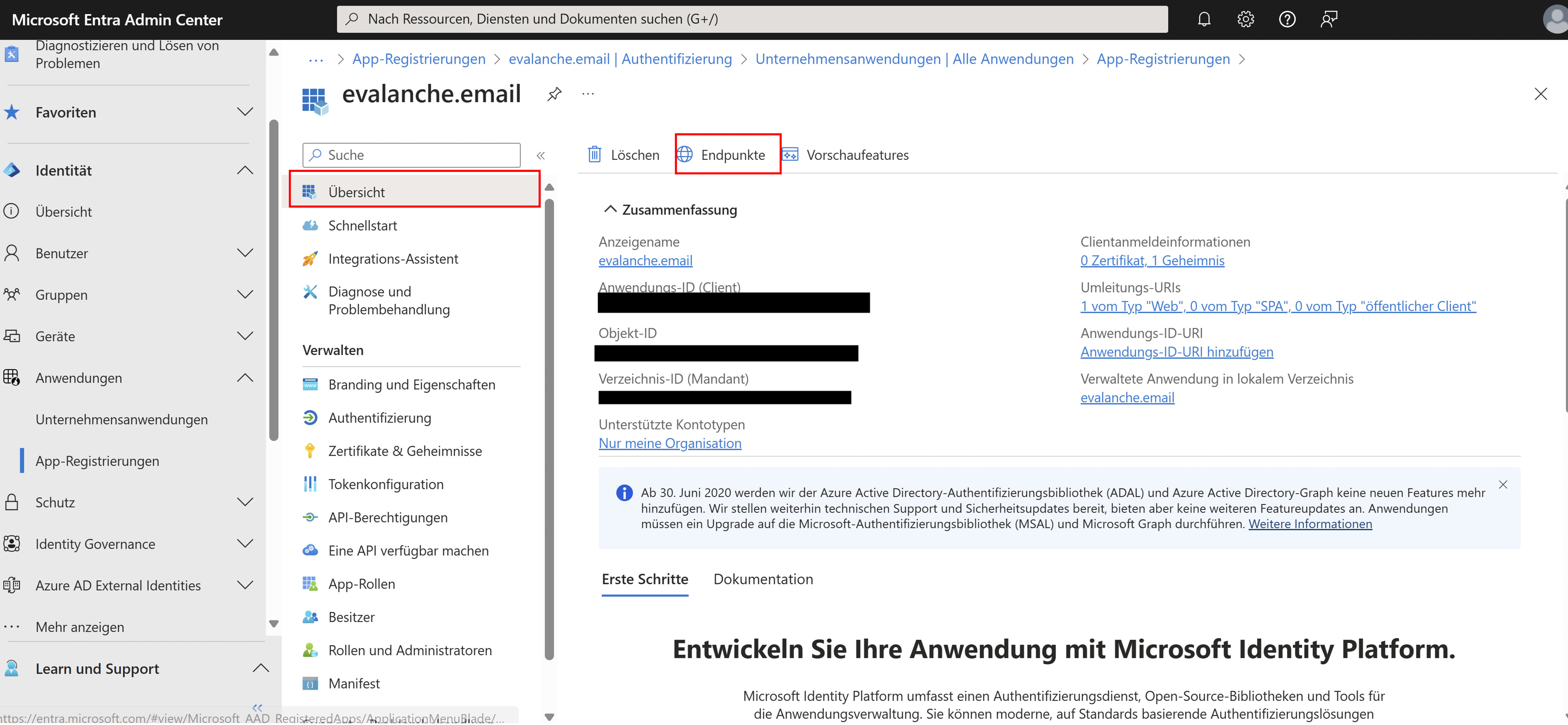 In der Übersicht Ihrer angelegten Applikation finden Sie alle benötigten Informationen zum Hinterlegen der Konfiguration in Evalanche. Nützliche URLs verbergen sich hinter dem Befehl Endpunkte.