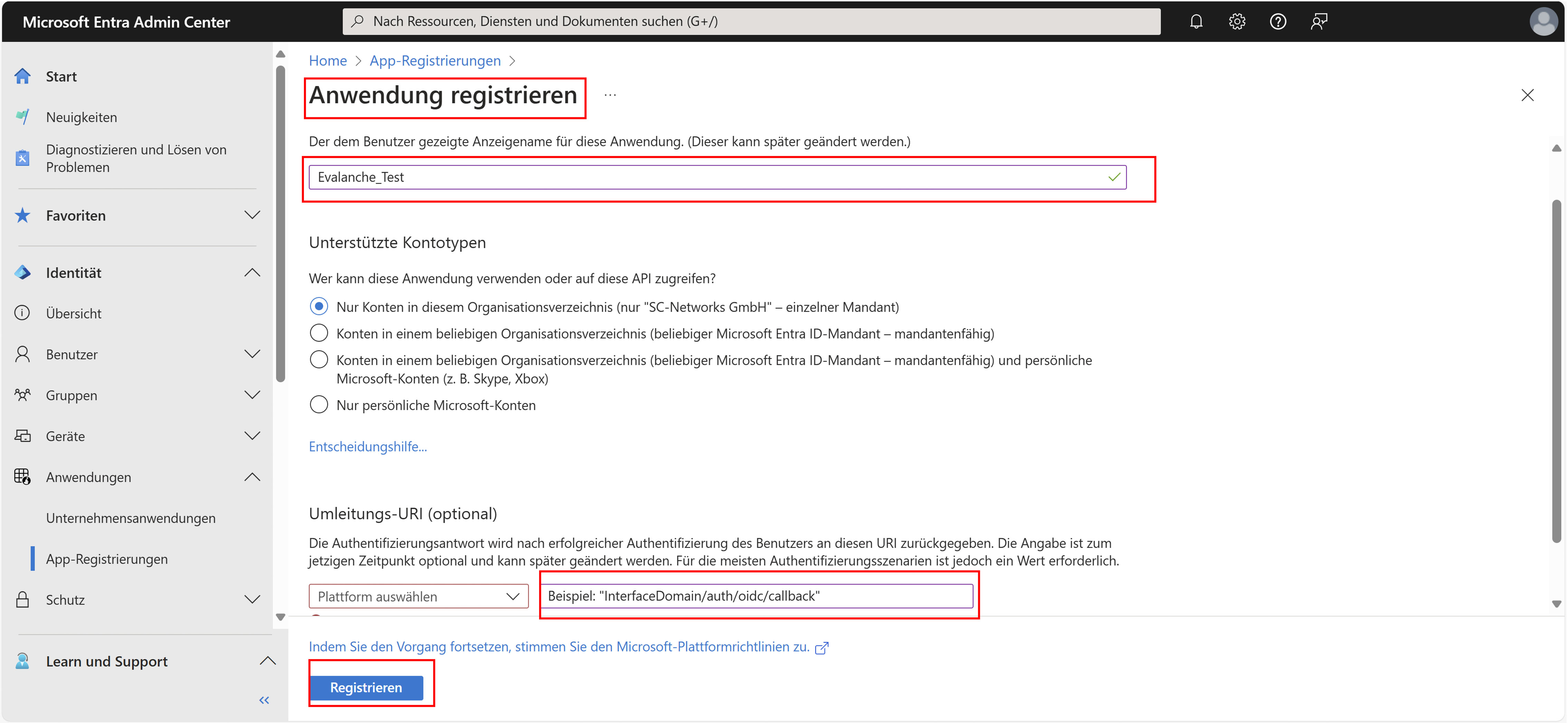 - Geben Sie unter Namen den Namen Ihrer Applikation z.B. „Evalanche“ und erfassen Sie die Umleitungs-URL. Diese sieht wie folgt aus: