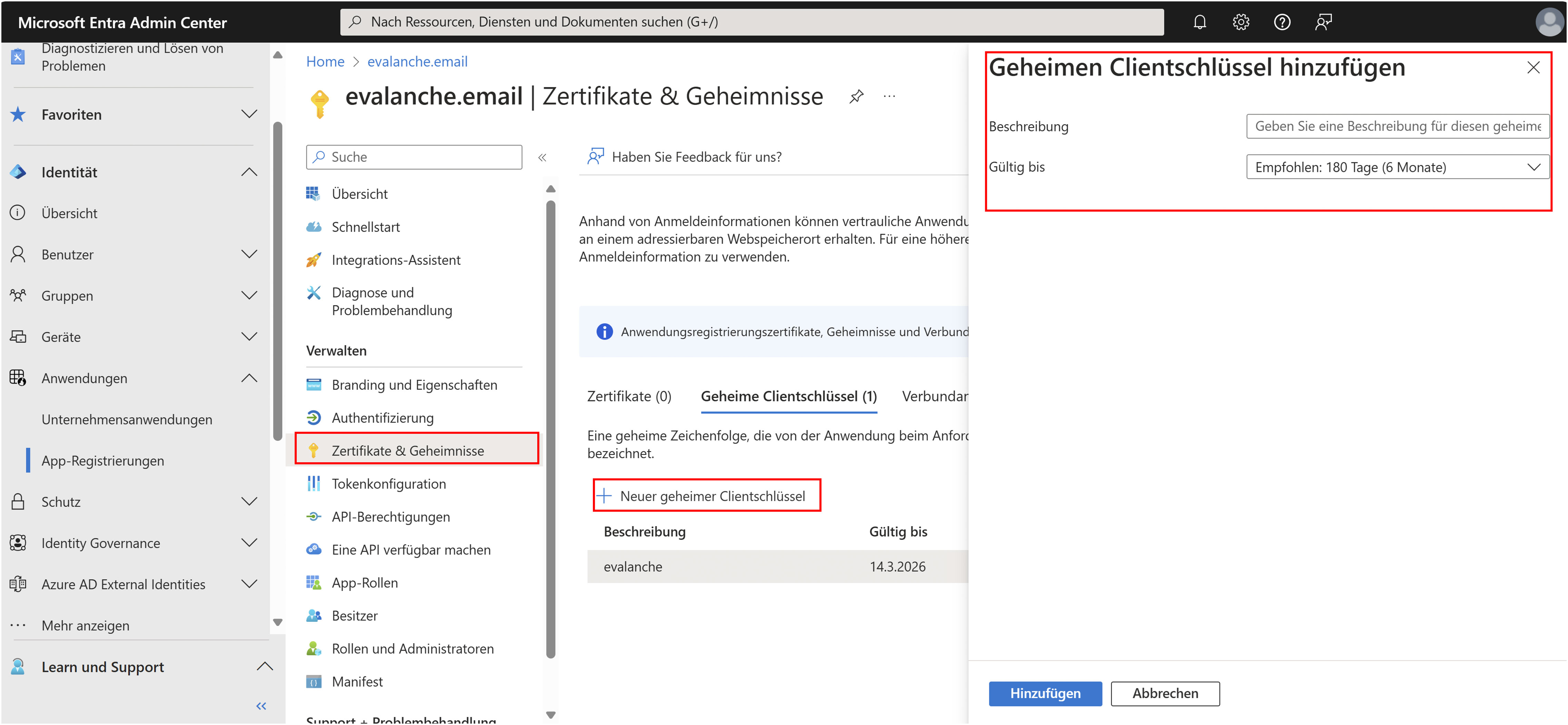 Klicken Sie in der linken Leiste 'Zertifikate & Geheimnisse' auf 'Neuer geheimer Clientschlüssel'