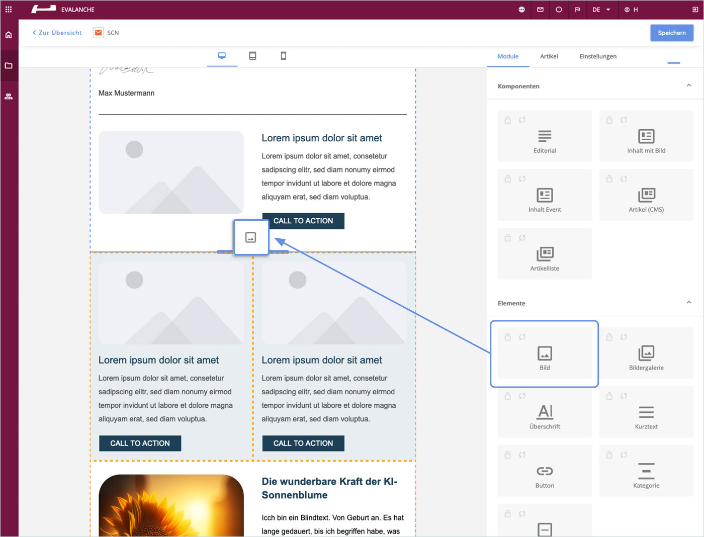 - Alternativ oder ergänzend können Sie auch mit den bereits vorgefertigten Komponenten arbeiten. Mit nur einem Drag-and-Drop-Vorgang lässt sich beispielsweise das Editorial mühelos erstellen.