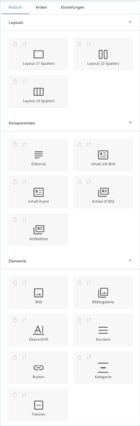 - Artikel: Dieser Reiter listet Artikel-Objekte auf, die per Drag & Drop in das Artikel (CMS)-Modul auf den Canvas gezogen werden können. Diese Funktion ist primär für die Arbeit mit bestehenden Artikel-Objekten relevant.