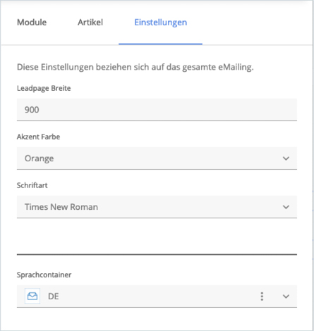 im Reiter Einstellungen können die Grundeinstellungen wie z.B. Breite, Farben und Schriftarten definiert werden, auf welche die Module zugreifen. Bei mehrsprachiger oder variantenreicher Nutzung können über Sprachcontainer verschiedene Versionen einer Leadpage verwaltet und ausgewählt werden. Dabei kann es sich sowohl um unterschiedliche Sprachvarianten als auch um inhaltliche oder gestalterische Abweichungen handeln.
