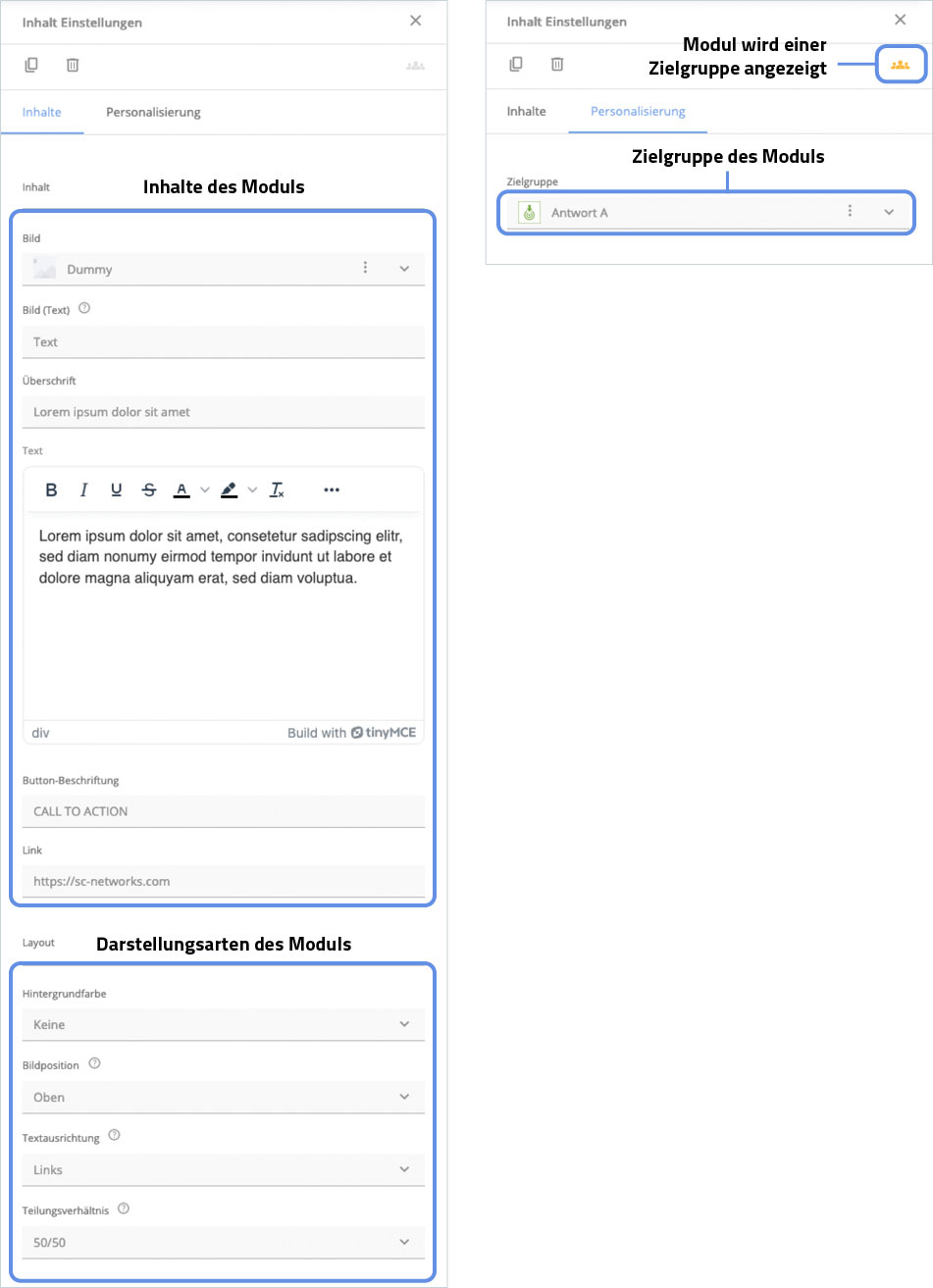 In diesem Beispiel-Modul werden alle Inhalte wie Texte und Bilder in entsprechende Eingabefelder eingegeben. Spezielle Felder ermöglichen die Anpassung der Bildausrichtung oder des Teilungsverhältnisses (Bild/Text). Unter dem Reiter ‚Personalisierung‘ lässt sich eine Zielgruppe definieren, für die der Modulinhalt exklusiv angezeigt wird.