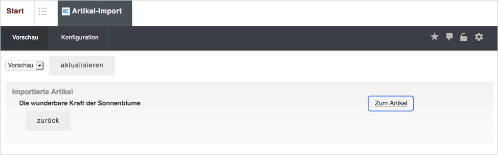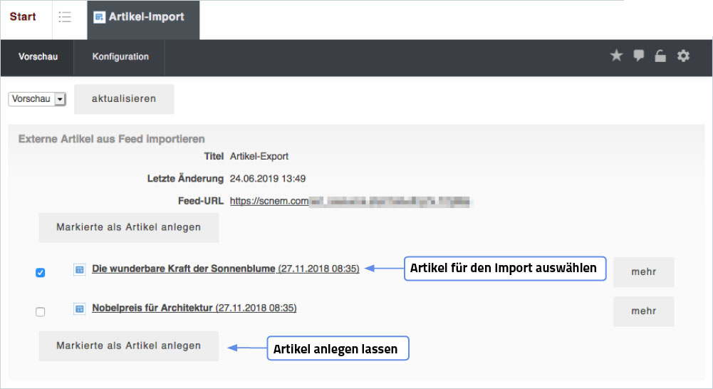 Alle Artikel aus dem Feed werden als Liste dargestellt. Wählen Sie die Artikel aus, welche Sie importieren möchten und importieren Sie diese mit einem Klick auf "Markierte als Artikel anlegen".