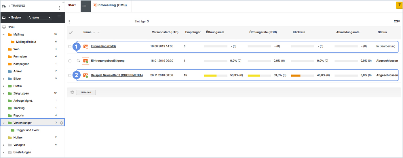 - Öffnungsrate: Empfänger, die das eMailing mindestens einmal geöffnet haben