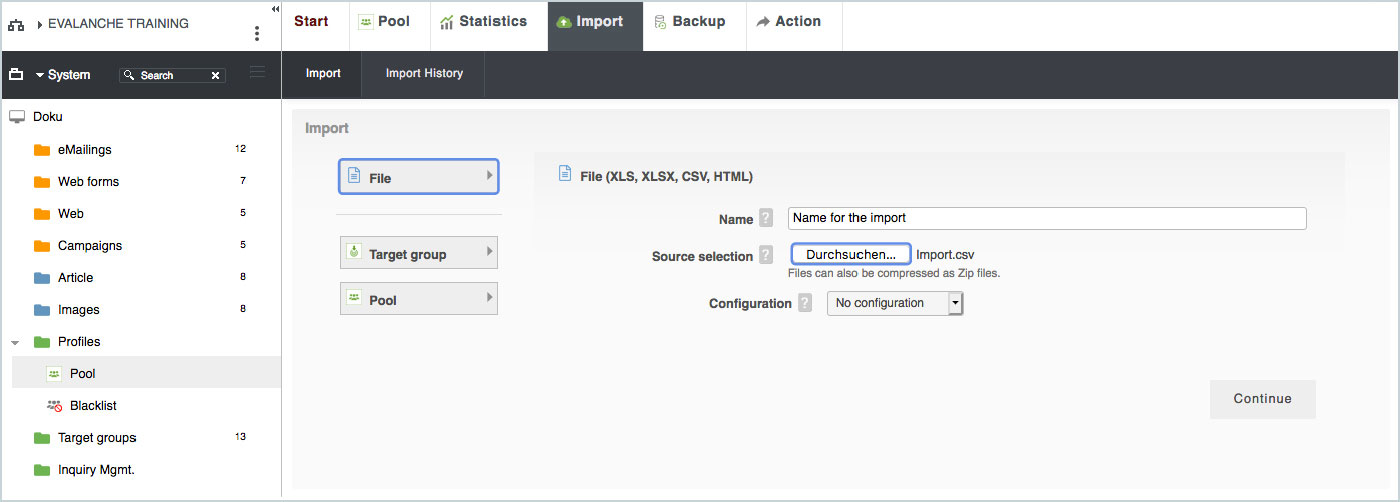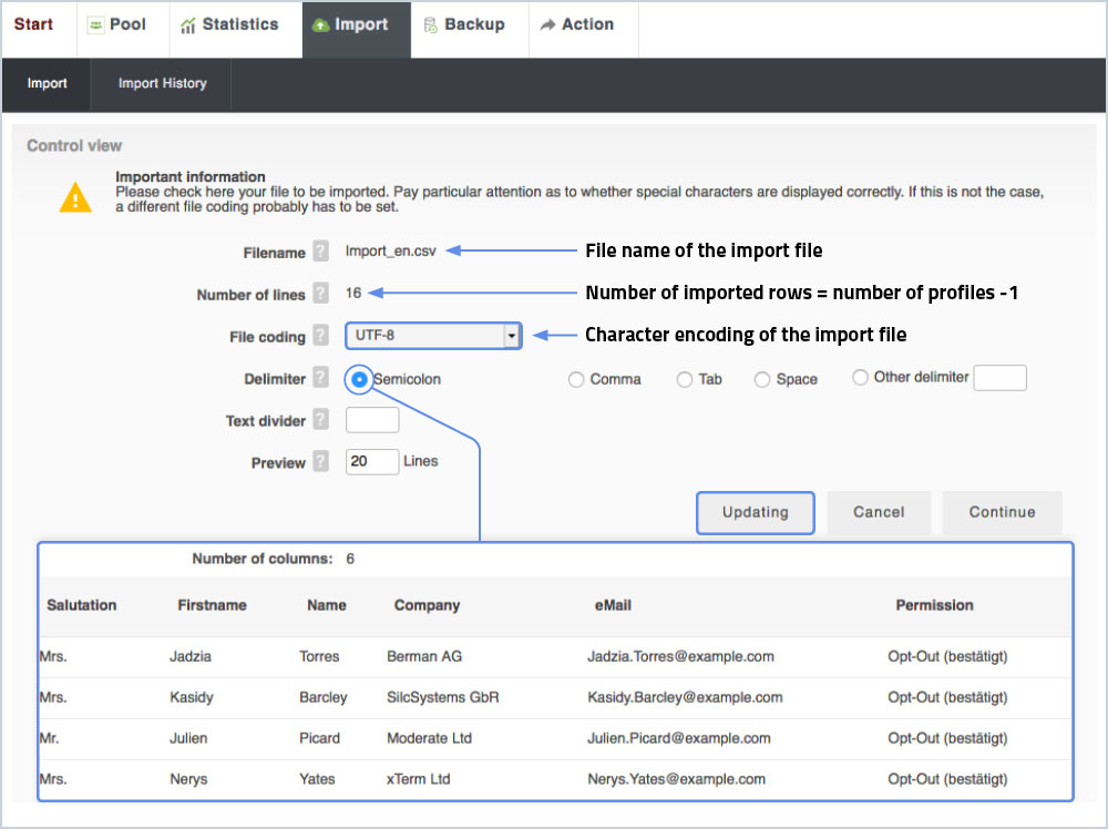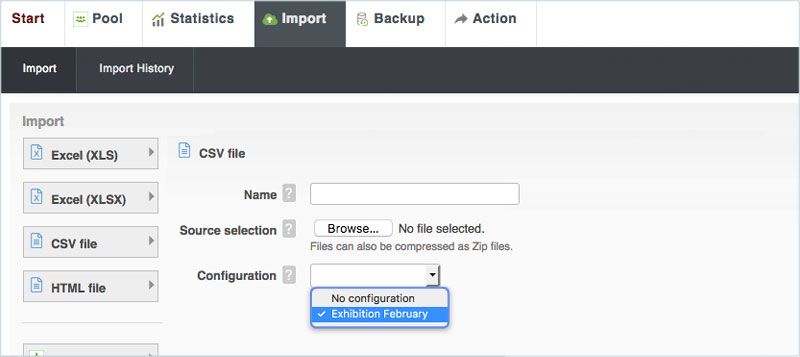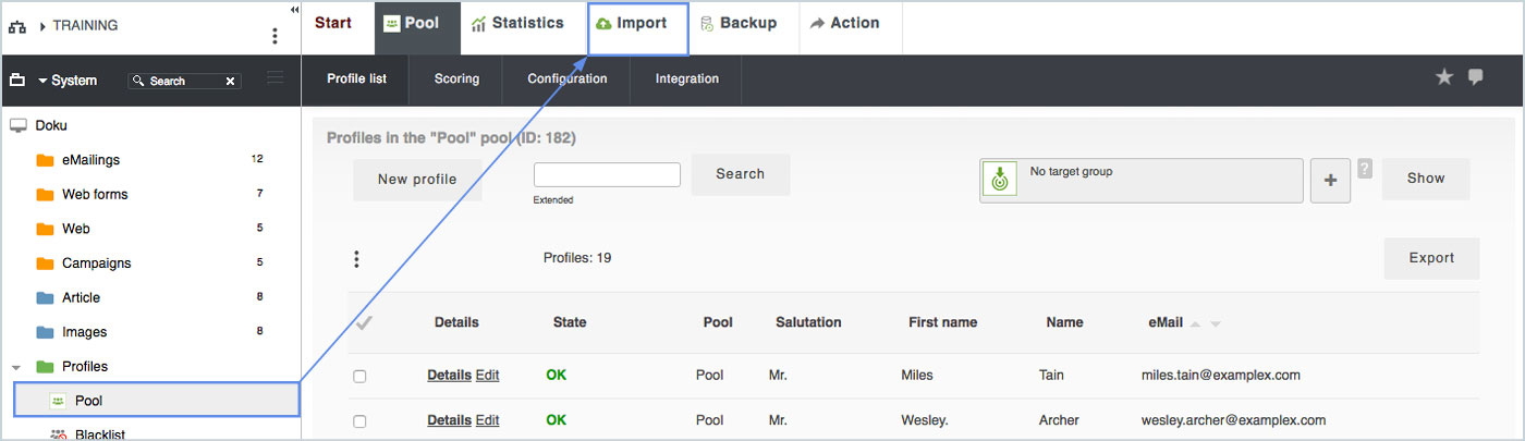 To import profiles into the system, this data must be summarized in a tabular text file. This is usually done in a spreadsheet program such as Open-Office or Excel. The system can import different types of files, but these files should have a clean data structure. For fast and reliable data import, we strongly recommend importing a simple CSV file -UTF-8 encoded. Only import fields and columns that are needed. Unused fields (columns) should be omitted, this will reduce the file size and speed up the import. A profile import can be performed in the pool under the Import navigation tab. Here you can import profiles from a file or format existing profiles.