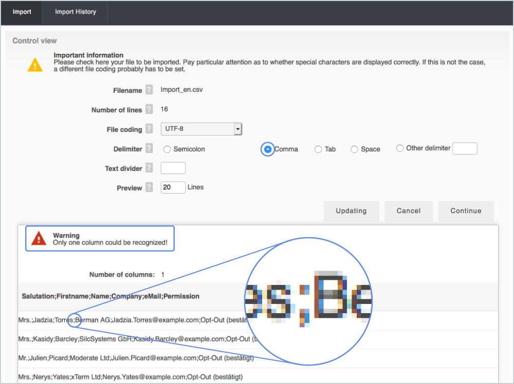 You can see whether the correct delimiter and file encoding was used in the control view. Here, the columns must be divided correctly and the special characters must be displayed correctly, and you may have to update the view.