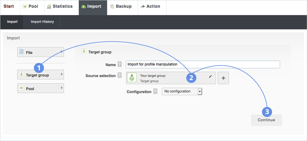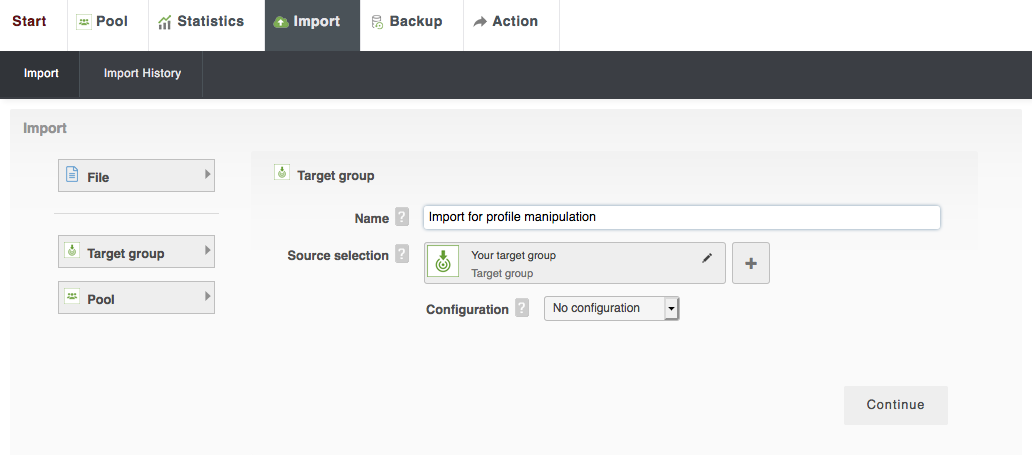 - Click on the Target group button in the Import tab of the pool and enter a name for the import.