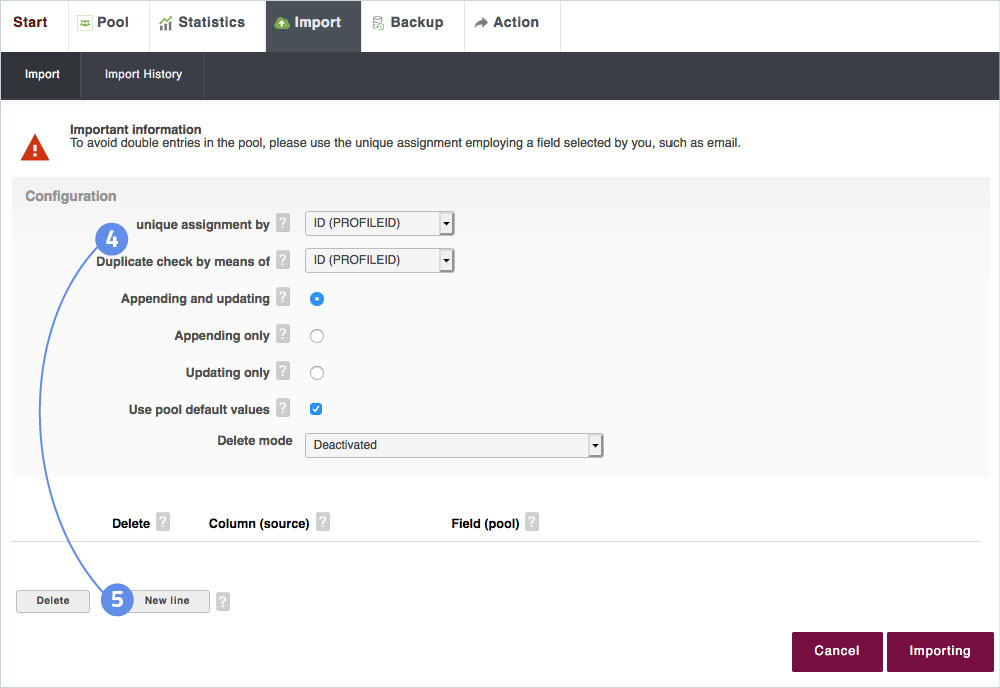 Unique assignment per: This is the primary key of the import, i.e. the data records to be imported are compared e.g. on the basis of the field "eMail" whether these already exist in the pool. If this is the case, the existing data records are updated. If the field is left empty, no check takes place, all profiles are newly created.