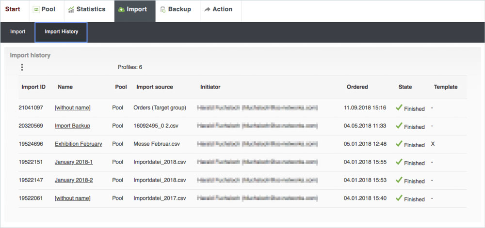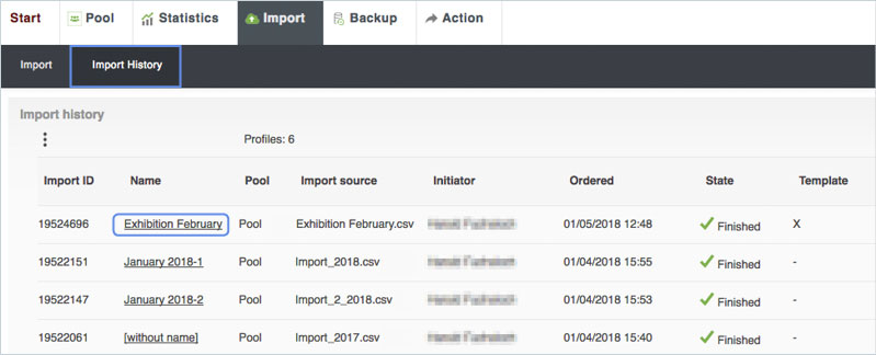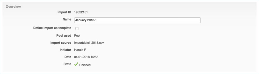 The import history shows all imports made in a list view. A click on the name of an import shows the details of the respective import.