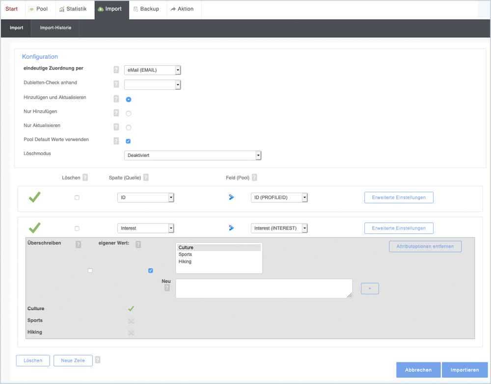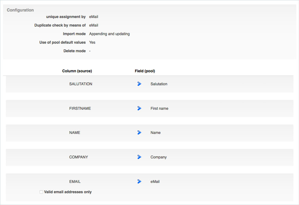 In the Configuration area you can see how the unique assignment of the profiles and the duplicate check was set, as well as the assignment of the columns to the fields in the pool.