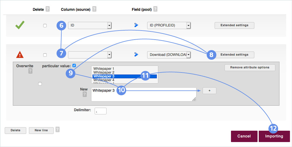 You can also use a target group import to remove values from profiles. In this case, you want to remove selected values from the Download (Multiple Selection) field. Proceed as described for the previous topic (Enhancing Profiles with Values) up to step 8.