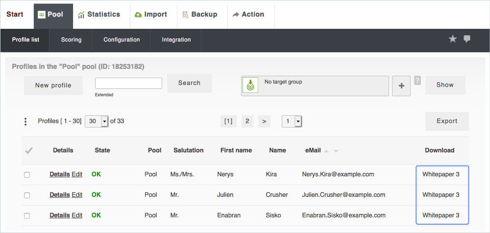 - Unique assignment of the profiles in the import file to the profiles in the pool (by eMail).