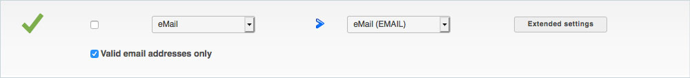 With the field type eMail the option "Only valid eMail addresses" is available. If this checkbox is activated, only profiles with a valid e-mail address will be imported.