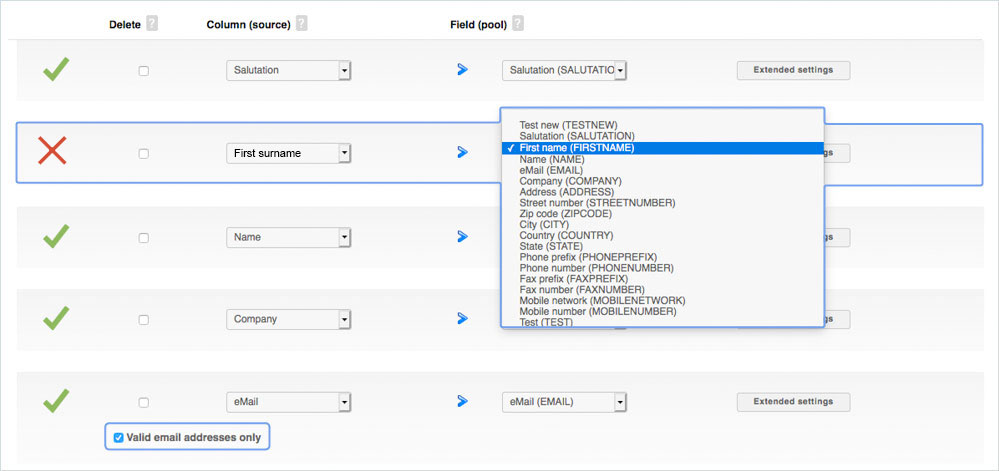 The system tries to assign the columns of the import file to the fields in the pool as far as possible. If it finds a match, you see a green check mark, otherwise a red cross. In this case, select the correct pool field from the dropdown menu on the right. The red X will then become a green check mark. When all check marks are green, click on Import in the lower right corner and the import will start. After the successful import you will receive a confirmation e-mail.